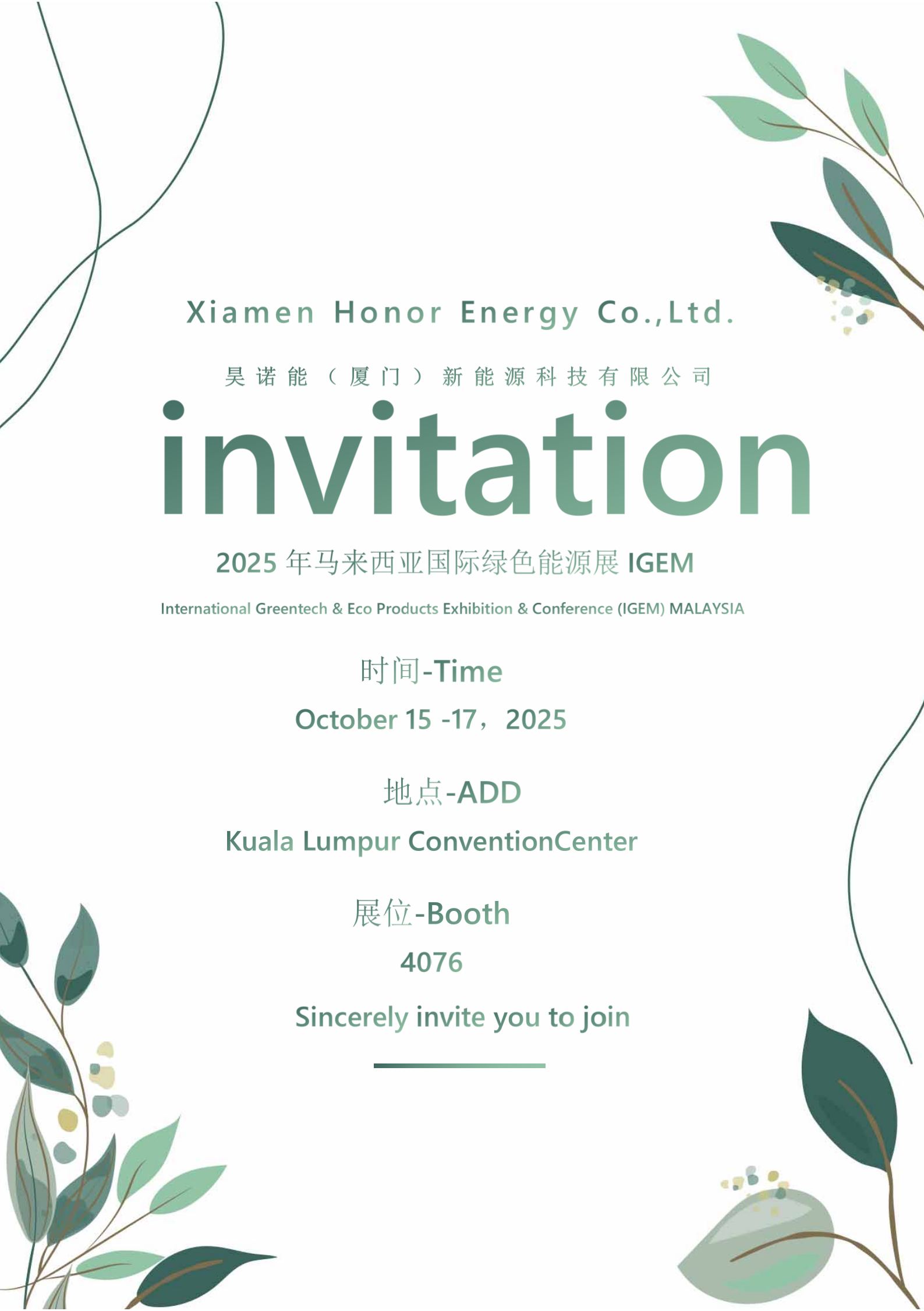 Noisono contentiper annunciarvi il nostro invito ufficiale per la Malaysia International Green Energy Exhibition (IGEM) del 2025.
